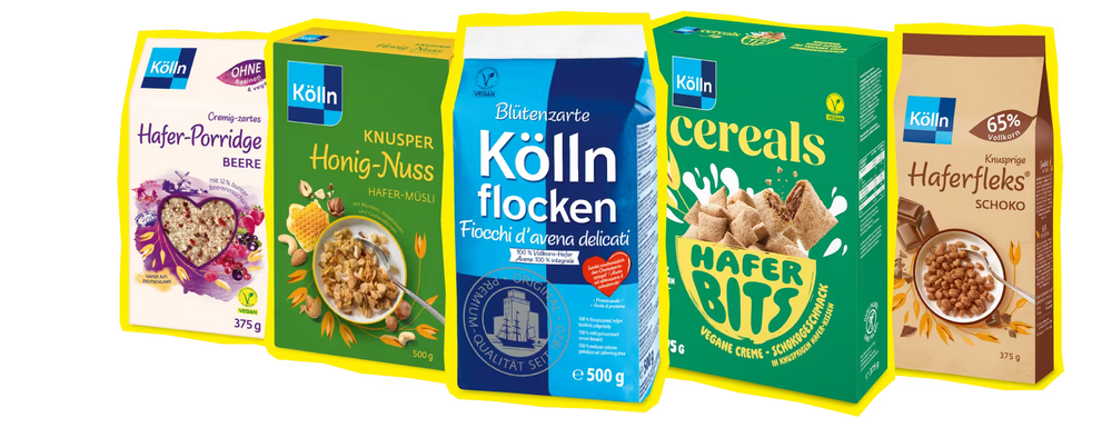 Particularly large oat kernels are flaked directly to produce Regular Rolled Kölln Oat Flakes (firm-tio-the-bite structure = large leaf flakes) flaky. Slightly smaller oat kernels are cut into groats to produce Delicate Kölln Oat Flakes (delicate structure = small leaf flakes). Ground oat kernels (wholegrain oat flour) are processed into Soluble Oats Instant and Schmelzflocken.