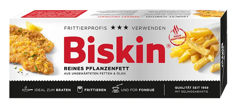 Hot, hotter, Biskin! Whether frying, deep-frying or baking – with high-quality vegetable oils and fats, Biskin brings your food to perfection. Steaks, fries or donuts? With Biskin, it's simply better!
