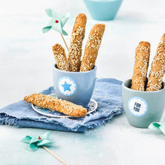 2You then knead the fruit mixture with the Mazola® and Kölln Schmelzflacken® to form a smooth dough. Form them into sticks about the length and thickness of your index finger, roll them in sesame seeds and place them on a baking tray lined with baking paper. Bake in the oven on the middle rack.