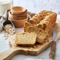 4Knead the dough briefly with your hands on a floured work surface. Grease a loaf tin (approx. 8 x 11 x 30 cm) and dust it with flour. Pour the dough into the mold. Let rise again for about 30 minutes. Sprinkle the dough with crunchy oat flakes. Bake in the preheated oven.
