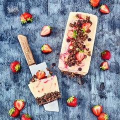 1Lightly chop the Kölln muesli using a food storage bag and a rolling pin. Melt the butter in a pot and add the Kölln muesli. Remove pot from heat. Line a loaf tin (25 diameter) with cling film and cover the bottom with the muesli-butter mixture. Press firmly and place in the refrigerator. Set aside 2-3 strawberries for garnish. Wash, sort and puree more strawberries. Beat the cream until stiff and add the sugar and Greek yogurt. Mix well together. Beat the egg yolks with lemon juice until a light cream forms and fold into the cream-yoghurt mixture. Now also add the strawberry puree and stir until a light marbling occurs. Then pour it into the loaf pan and let it freeze for at least 8 hours. Remove the ice cream cake from the mold and carefully remove the cling film. Garnish with Kölln muesli and strawberries. Allow to thaw for 10 minutes and serve. Preparation time: approx. 35 minutes (without waiting time)