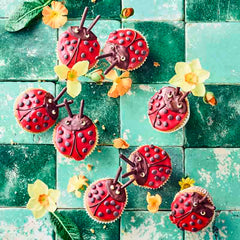 3Melt the couverture and apply it to the head and wings onto the hardened red icing. Decorate with chocolate drops and Mikado sticks.
