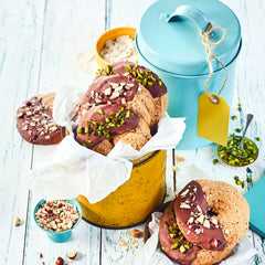 3Let cool on a cake rack. Chop the couverture and melt it together with the palmin in a warm water bath. Dip half of the rings into the chocolate coating, sprinkle with sprinkles or nuts and allow to set. Top/bottom heat: 190°C Circulating air: 170°C Baking time: approx. 12 minutes Preparation time: approx. 70 minutes